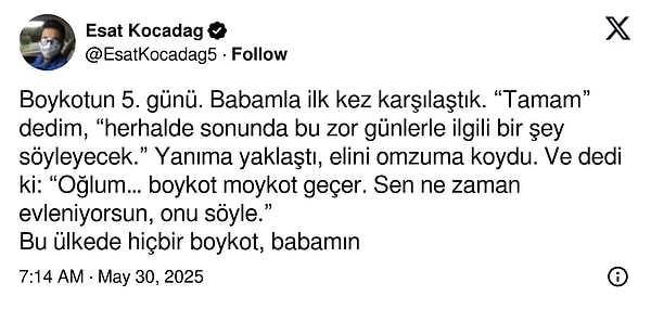 CHP’nin boykot listesinin başını çeken ünlü kahve zinciri Espressolab, Mart ayından bu yana en çok konuşulan markalardan biri oldu. Boykot davetlerinin akabinde ziyanlarını açıklayan Espressolab’in sahibi Esat Kocadağ, X hesabından babasıyla ortasında geçen boykot anısını anlattı.
