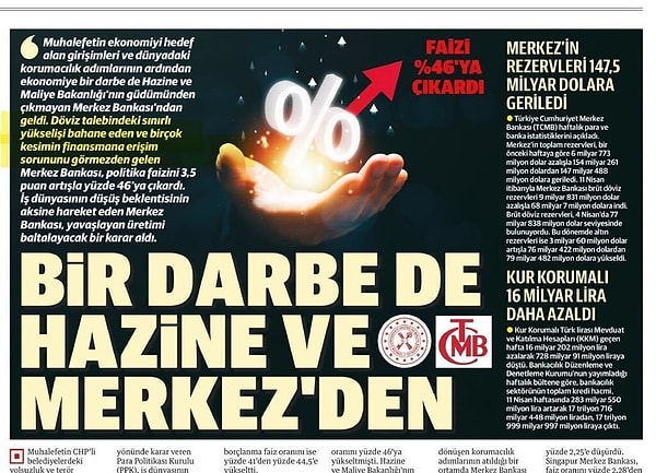 “Ekonomiye bir darbe de Hazine Bakanlığı’nın güdümünden çıkmayan Merkez Bankası’ndan geldi. Döviz talebindeki sonlu yükselişi mazeret eden ve gerçek bölümün finansmana erişim problemini görmezden gelen Merkez Bankası, siyaset faizini 3,5 puan artışla yüzde 46’ya çıkardı. İş dünyasının faizlerde düşüş beklentisinin bilakis hareket eden Merkez Bankası, yavaşlayan üretimi daha da baltalayacak bir karara imza attı.”