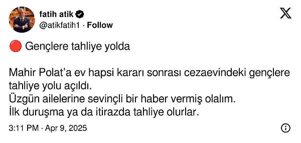 ‘Mahir Polat’a mesken mahpusu kararı sonrası cezaevindeki gençlere tahliye yolu açıldı. Üzgün ailelerine sevinçli bir haber vermiş olalım. Birinci duruşma ya da itirazda tahliye olurlar.’ tabirlerini kullandı.