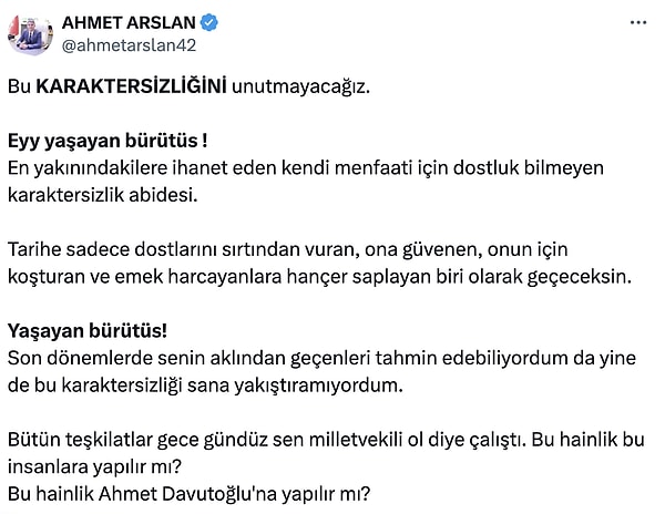 Bu süreçte birlikte çalıştığımız Genel Liderimiz Prof. Dr. Sn. Ahmet Davutoğlu’na ve partili arkadaşlarıma teşekkür eder, bundan sonraki siyasi çalışmalarında muvaffakiyetler dilerim.Kamuoyuna hürmet ile duyurulur.’ açıklamasında bulundu. Ayrıyeten paylaşımını yorumlara kapadı.