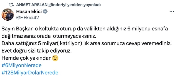 Ahmet Arslan ayrıyeten Hasan Ekici’nin Konya’nın AKP’li Büyükşehir Belediye Başkanı İbrahim Altay’ı eleştirdiği paylaşımı yine deverana soktu.