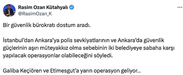 Kütahyalı bu sefer Keçiören ve Etimesgut Belediyelerine operasyon yapılacağını öne sürdü.