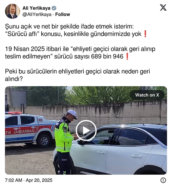 İçişleri Bakanı Ali Yerlikaya’nın sosyal medyadaki son paylaşımı “ehliyet affı” argümanlarıyla ilgili oldu.