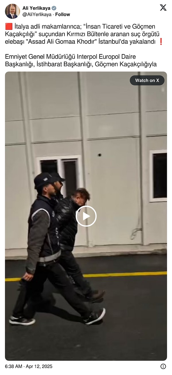 ‘İtalya isimli makamlarınca; “İnsan Ticareti ve Göçmen Kaçakçılığı” hatasından Kırmızı Bültenle aranan hata örgütü elebaşı ‘Assad Ali Gomaa Khodır’ İstanbul’da yakalandı.