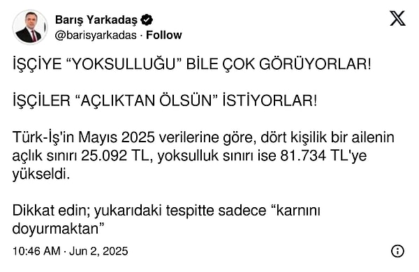 Türk-İş’in Mayıs 2025 bilgilerine nazaran, dört kişilik bir ailenin açlık sonu 25.092 TL, yoksulluk hududu ise 81.734 TL’ye yükseldi.