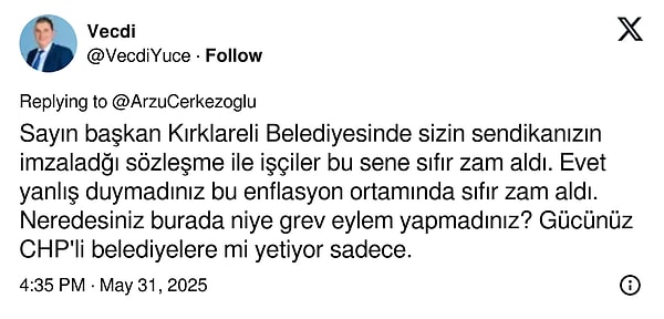 ‘Sayın lider Kırklareli Belediyesinde sizin sendikanızın imzaladığı mukavele ile personeller bu sene sıfır artırım aldı. Evet yanlış duymadınız bu enflasyon ortamında sıfır artırım aldı. Neredesiniz burada niçin grev aksiyon yapmadınız? Gücünüz CHP’li belediyelere mi yetiyor yalnızca.’