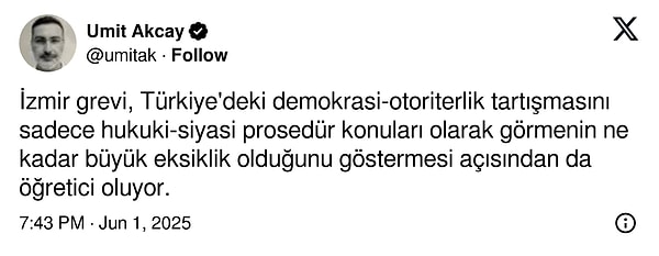 ‘İzmir grevi, Türkiye’deki demokrasi-otoriterlik tartışmasını yalnızca hukuki-siyasi prosedür hususları olarak görmenin ne kadar büyük eksiklik olduğunu göstermesi açısından da öğretici oluyor.’