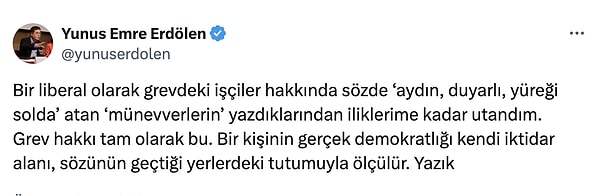 ‘Bir liberal olarak grevdeki çalışanlar hakkında kelamda ‘aydın, hassas, yüreği solda’ atan ‘münevverlerin’ yazdıklarından iliklerime kadar utandım.
