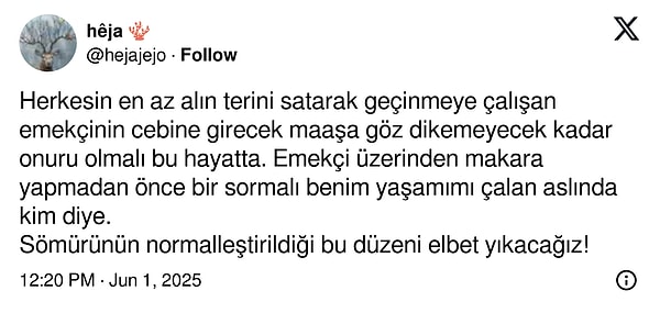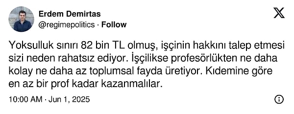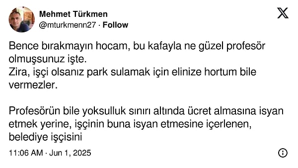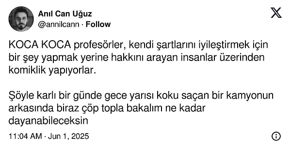 Profesörün bile yoksulluk hududu altında fiyat almasına isyan etmek yerine, emekçinin buna isyan etmesine içerlenen, belediye emekçisini yoksulluk hududunda bir fiyata bile layık görmeyen bir başla akademide işgal ettiğiniz yer gereğince büyük bir sorunmuş esasen. Bari emekçilerden uzak durun.