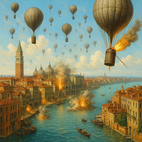Venedik Balon Saldırısı (1849): Avusturya-Macaristan, Venedik’e 200 dinamit yüklü pilotsuz balon gönderdi. Fitilin yanma müddeti hesaplanarak, balonun Venedik’in üstüne geldiği anda patlaması hedeflendi. Rüzgar nedeniyle kimileri gayesi şaşırsa da birinci uzaktan hava saldırısı olarak tarihe geçti.