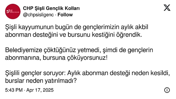 CHP Şişli Gençlik Kolları ise karara tepkiliydi.