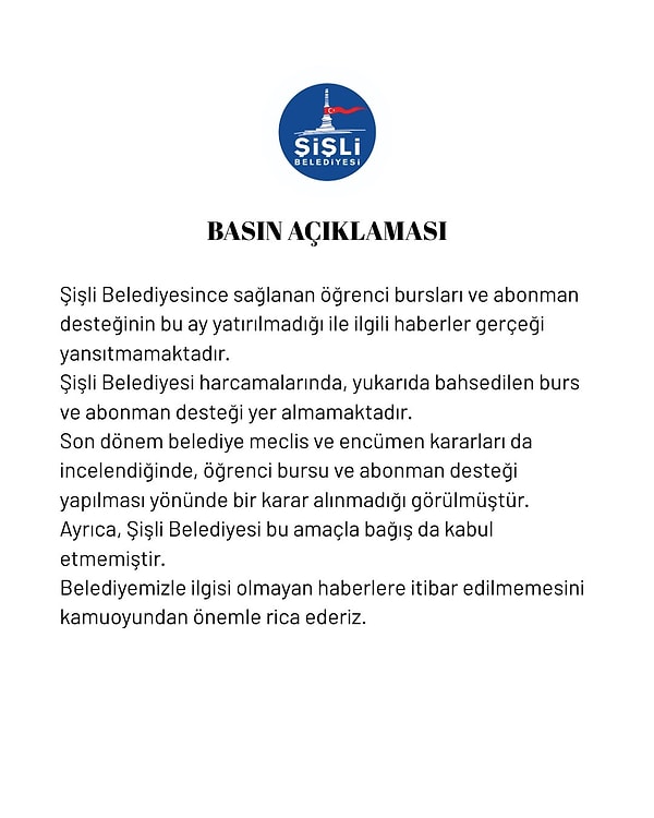 Kayyum atanan Şişli Belediyesi hususla ilgili bir açıklama yayınladı.