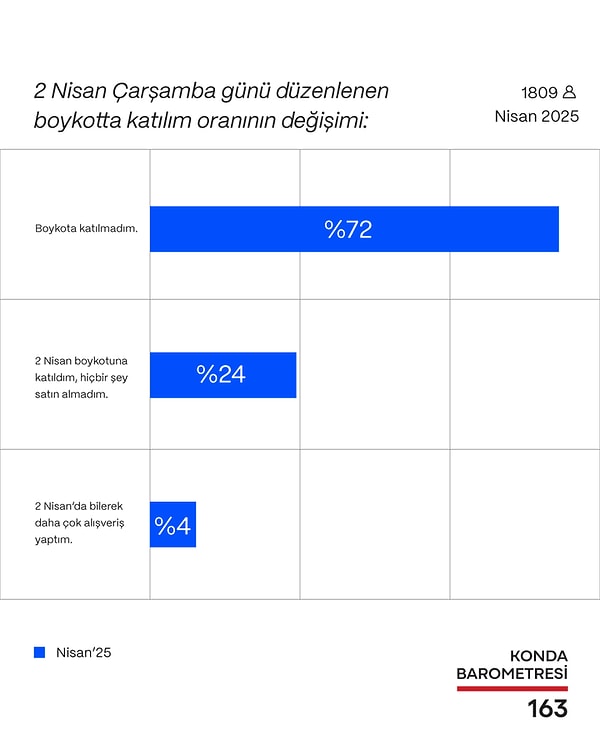 Konda’nın araştırmasına nazaran 2 Nisan’da yapılan genel boykota iştirak sağlayanların oranı yüzde 24 oldu. Ankete katılanların yüzde 72’si boykota katılmadığını söz ederken, yüzde 4’lük bir kısım ise 2 Nisan’da çok daha fazla alışveriş yaptığını belirtti.