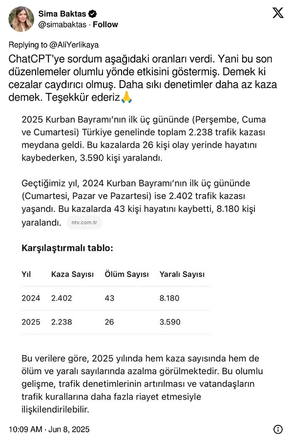 Denetlemelerimiz süreç yapmak için değil, kazaları önlemek ve can kaybımızı sıfıra indirmek içindir. Trafik kurallarına uyalım, bayram sevincimize hüzün karışmasın. Hayatını kaybeden vatandaşlarımıza Allah’tan rahmet, yaralılarımıza acil şifalar diliyorum.