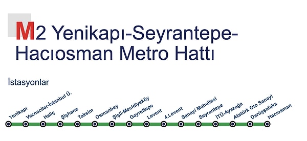 Yenikapı ile Hacıosman ortasında hizmet veren M2 metro sınırının hat uzunluğu 23,49 km’dir. Toplamda 16 istasyonda hizmet veren M2’de 192 adet araç bulunur. Metro haritası M2 ise üstteki görselde verilmiştir.