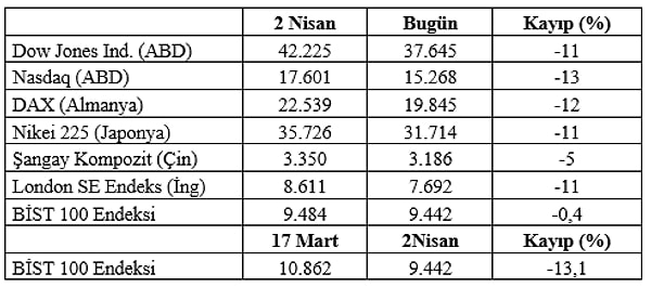 Eğilmez, yazısında 2 Nisan’dan bu yana borsalarda olan değişikliği tabloyla açıkladı: “2 Nisan’dan bu yana dünya borsa endeksleri yüzde 11 ile 13 ortasında paha kaybı yaşamış. En ilginci ise en yüksek gümrük vergisi oranı uygulanacak olan Çin’in borsa endeksi Şangay Kompozit Endeksinin yüzde 5 kıymet kaybetmiş olması.”