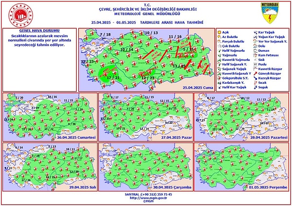 Meteoroloji 25 Nisan 1 Mayıs ortasında ülke genelinde sıcaklıkların mevsim normalleri altında seyredeceğini belirtti. Meteoroloji haritasına nazaran ise Türkiye geneli yağışlı olacak.