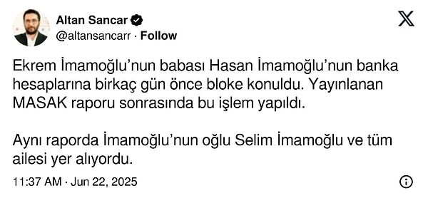 Gazeteci Altan Sancar, Ekrem İmamoğlu’nun babası Hasan İmamoğlu’nun banka hesaplarına yayınlanan MASAK raporu sonrasında bloke konulduğunu açıkladı.