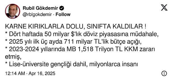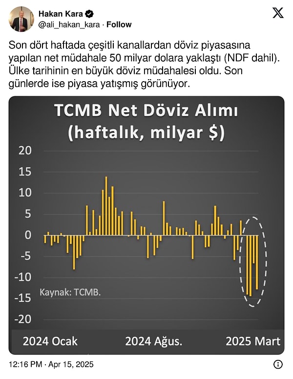 İstanbul Büyükşehir Belediye Başkanı Ekrem İmamoğlu’nun 19 Mart 2025 Çarşamba günü gözaltına alınmasının akabinde piyasalar da adeta zelzele olmuştu. Merkez Bankası’nın 19 Mart-21 Mart ortasında 25 milyar dolar döviz satışı gerçekleştirdiği ileri sürülmüştü. Dövize müdahalesi devam ediyor mu diye merak edilirken Merkez Bankası eski Başekonomisti Prof. Dr. Hakan Kara, X hesabından çarpıcı bir açıklama yaptı.