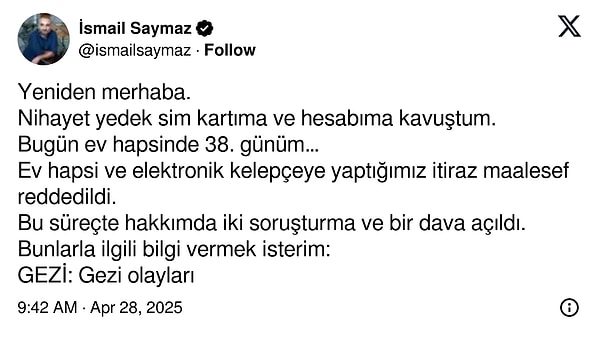 Ev mahpusunda bulunan İsmail Saymaz uzun süren sessizliğini geçtiğimiz günlerde bozmuştu.