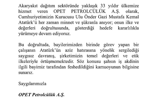 Atatürk’e küfür eden kişinin çalıştığı şirket olan Opet, kelam konusu kişinin kovulduğunu açıkladı.