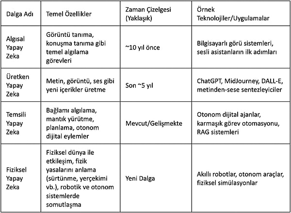 Huang, yapay zekanın gelişimini daha yeterli anlatmak için bu süreci dört başka “dalga” üzerinden açıklıyor. Ona nazaran yapay zeka son 10 yılda şu dört büyük evrimsel kademeden geçiyor: