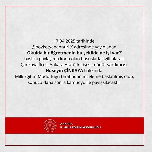 Ankara İl Milli Eğitim Müdürlüğü toplumsal medya hesabından yapılan paylaşımda, ‘@boykotyapannuri X adresinde yayınlanan ‘Okulda bir öğretmenin bu formda ne işi var?’ başlıklı paylaşıma bahis olan konularla ilgili olarak Çankaya ilçesi Ankara Atatürk Lisesi müdür yardımcısı Hüseyin Çinkaya hakkında, Milli Eğitim Müdürlüğü tarafından inceleme başlatılmış olup, sonucu daha sonra kamuoyu ile paylaşılacaktır’ denildi.