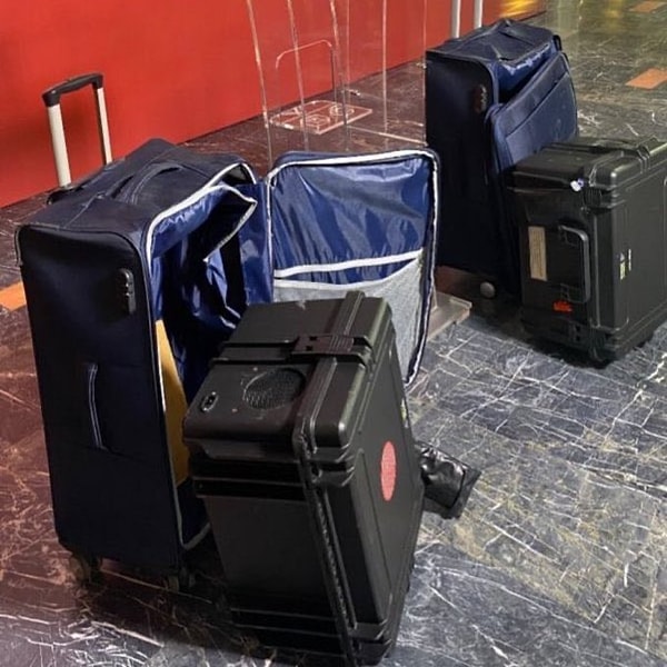 Özgür Çelik yaptığı açıklamada, “Bu valizlerin içerisinde gördüğünüz üzere sinyal kesiciler var. Bu sinyal kesiciler 20-25 kilo o nedenle de bavulla taşınıyor.’ dedi.