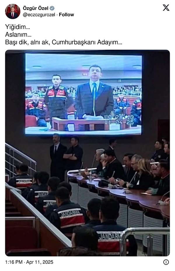 İBB Başkanı Ekrem İmamoğlu’nun bugün (11 Nisan Cuma) iki başka davası görüldü. İstanbul Cumhuriyet Başsavcısı Akın Gürlek davasında savunma yapan Ekrem İmamoğlu’nun mahkemeden birinci imgesi de paylaşıldı.