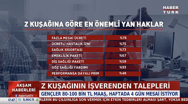 Araştırmaya nazaran 28 yaş altı her 6 şahıstan 1’i ofiste çalışma koşulu olarak ahenge alanı olmasını bekliyor. Genç çalışanların yüzde 33’ü fiyatsız yemek yahut atıştırmalık bekliyor, yüzde 20’si ise oyun alanları talep ediyor. Ülkemizde yapılan röportajlarda da 80-100 bin TL maaş ve haftada 4 gün mesai istendiği görülüyor.
