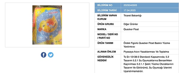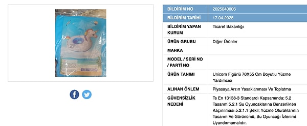 Ticaret Bakanlığı, Güvensiz Ürün Bilgi Sistemi aracılığıyla insan sağlına ziyanlı unsurlar bulunduran eserleri ifşalamaya devam ediyor.