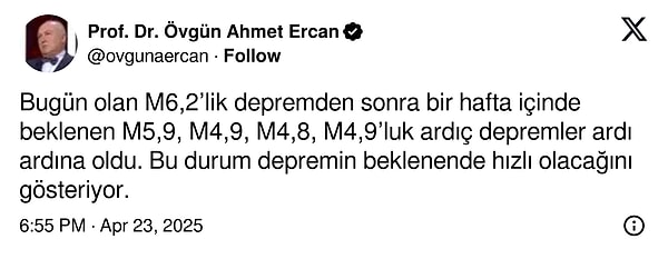 Prof. Dr. Ercan, X hesabı üzerinden M5,9, M4,9, M4,8, M4,9’luk artçı sarsıntıların gerisi gerisine olmasıyla büyük zelzelenin beklenenden süratli gerçekleşeceğini belirtti.