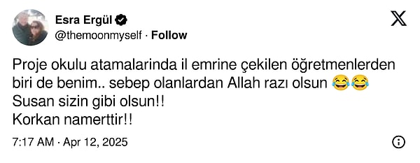 ‘Proje okulu atamalarında vilayet buyruğuna çekilen öğretmenlerden biri de benim.. sebep olanlardan Allah razı olsun 😂😂