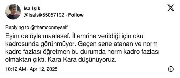 ‘Eşim de o denli maalesef. Vilayet buyruğuna verildiği için okul takımında görünmüyor. Geçen sene atanan ve norm takım fazlası öğretmen bu durumda norm takım fazlası olmaktan çıktı. Kara Kara düşünüyoruz.’