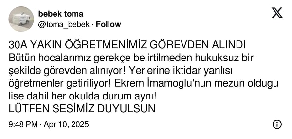 ‘Bütün hocalarımız münasebet belirtilmeden hukuksuz bir formda vazifeden alınıyor! Yerlerine iktidar yanlısı öğretmenler getiriliyor! Ekrem İmamoğlu’nun mezun olduğu lise dahil her okulda durum aynı!