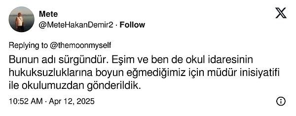 Esra Ergül isimli öğretmen de il emrine çekildiğini paylaştı: