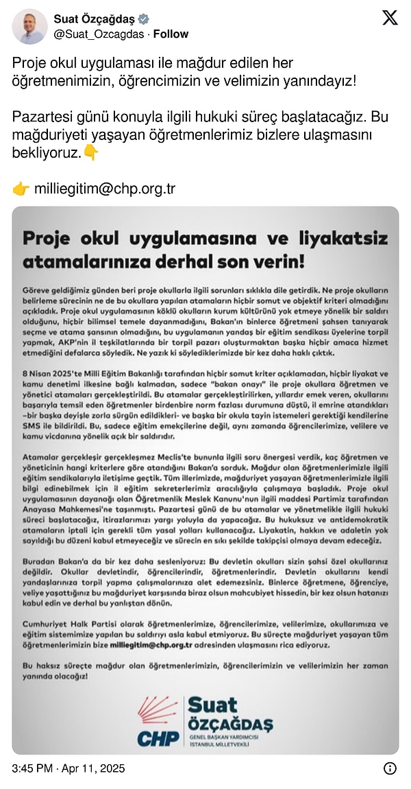 ‘2016 yılında İMTİHANLA atanmış tüm öğretmenleri sürgün edip, yerlerine daha torpilli öğretmenleri atayıp bunu ‘proje okulu’ ismi altında meşrulaştıranlar, artık ise torpillilerin yerine daha da torpillileri atamaya çalışıyor. Ülkedeki her kurum üzere Türkiye’nin önde gelen liselerinin de içini boşaltıp kadrolaşmaya başladılar ve artık bunu daha da kalıcı hale getirmek istiyorlar. Vaktinde yapılan haksızlığı durduramadık ancak bu seferki haksızlığın önüne geçmemiz gerekiyor.’