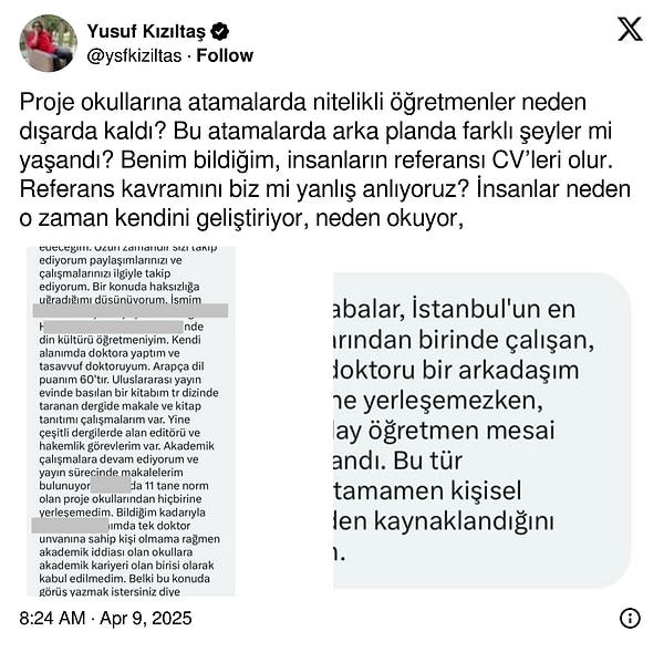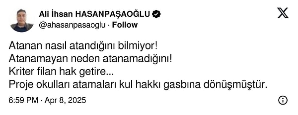 Bu biçim birçok ileti aldım. Yakın etrafımda de birçok nitelikli, kıdemli ve donanımlı öğretmen dışarda kaldı. Benzer sorun BİLSEM atamalarında da var. BİLSEM atamalarında da çok usulsüzlüğü duydum ve şahit oldum.’