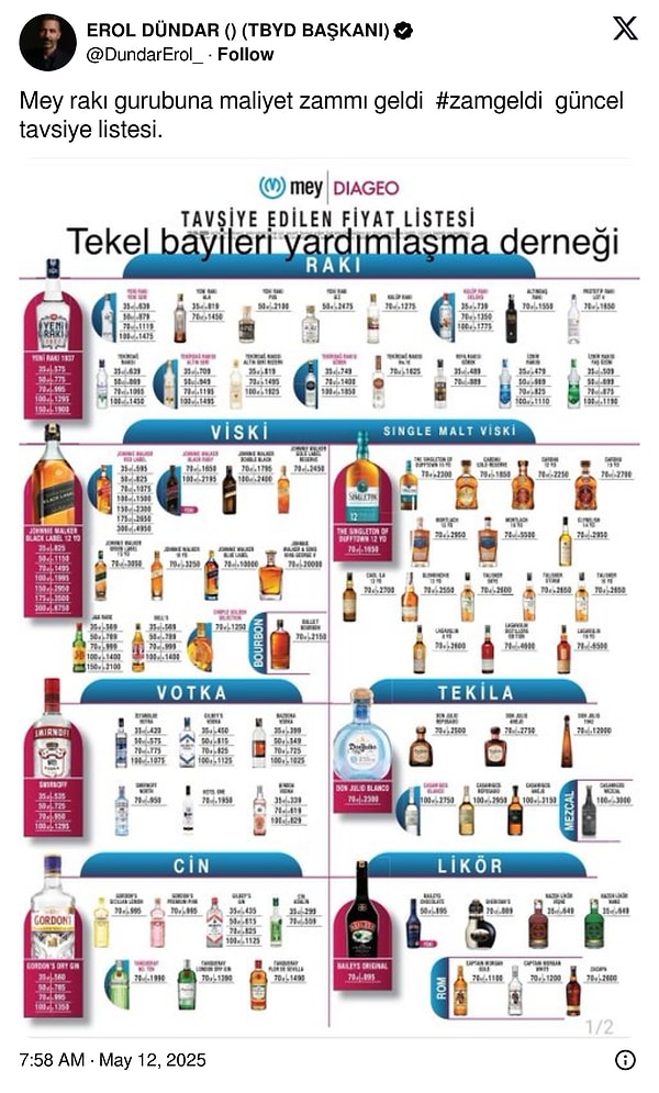 Rakı artırımını Monopol Bayileri Yardımlaşma Derneği Başkanı Erol Dündar, sosyal medya hesabından duyurdu. Dündar’ın yaptığı paylaşıma nazaran Mey rakı kümesine artırım geldi. Artırımın ‘maliyet’ münasebeti nedeniyle yapıldığını tabir eden Dündar, şimdiki rakı fiyatlarını da paylaştı.