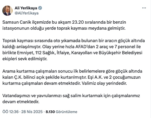 ‘Samsun Canik ilçemizde bu akşam 23.20 sıralarında bir akaryakıt istasyonunun olduğu yerde toprak kayması meydana gelmiştir.