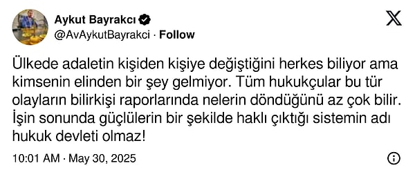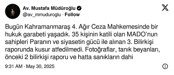 ‘Bugün Kahramanmaraş 4. Ağır Ceza Mahkemesinde bir hukuk garabeti yaşadık. 35 kişinin katili olan MADO’nun sahipleri Paranın ve siyasetin gücü ile alınan 3. Uzman raporunda kusur atfedilmedi. Fotoğraflar, şahit beyanları, evvelki 2 eksper raporu ve hatta sanıkların dahi kabul ettikleri tadilatlar 58 sayfalık raporda tamı tamına 3 cümle ile geçiştirilerek MADO’nun sahipleri hakkında kusur atfedilmedi ve isimli denetim kararları kaldırılarak duruşmalardan vareste tutuldu. Bugün mahkeme salonunda hukukun üstünlüğü olmazda üstünlerin hukukunun geçerli olduğunu lehlerine gelen birinci raporda isimli denetimlerinin kalkmasıyla anlamış olduk.’