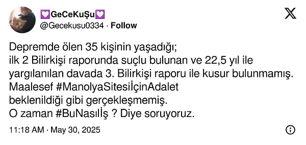 Kahramanmaraş sarsıntılarının davaları sürüyor. On binlerce kişinin vefatına neden olan sorumlulara yönelik yüreklere su serpen bir ceza verilmemesi öfkeyi ve adalete inançsızlığı giderek yükseltiyor. Devam eden davalardan birisi de 35 şahsa mezar olan Manolya Sitesi davası. Davanın beşinci duruşması gerçekleşti ve skandal bir karar verildi.