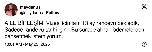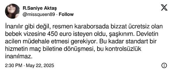 ‘İnanılır üzere değil, resmen karaborsada şahsen fiyatsız olan bebek vizesine 450 euro isteyen oldu, şaşkınım. Devletin hemen müdehale etmesi gerekiyor. Bu kadar standart bir hizmetin maç biletine dönüşmesi, bu kontrolsüzlük inanılmaz.’