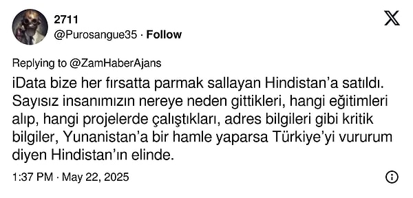 ‘iData bize her fırsatta parmak sallayan Hindistan’a satıldı. Sayısız insanımızın nereye neden gittikleri, hangi eğitimleri alıp, hangi projelerde çalıştıkları, adres bilgileri üzere kritik bilgiler, Yunanistan’a bir atılım yaparsa Türkiye’yi vururum diyen Hindistan’ın elinde.’