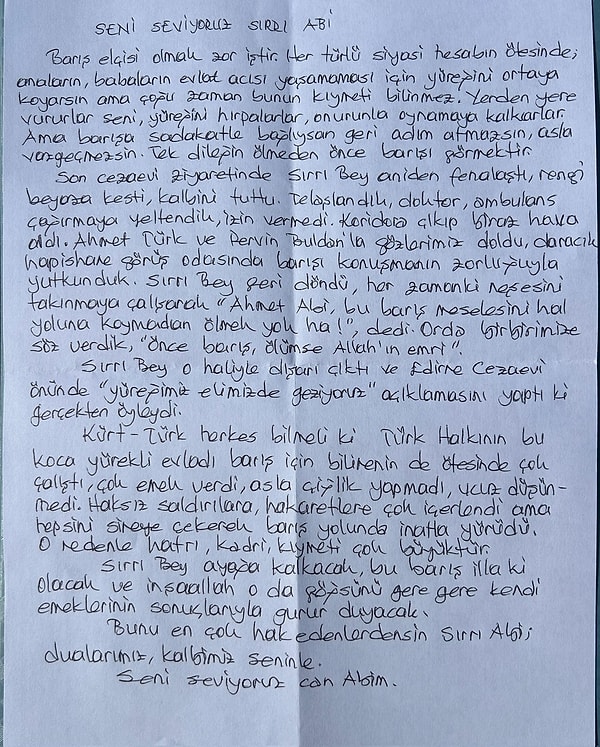 Demirtaş paylaşımını, “Sırrı Bey ayağa kalkacak, bu barış illa ki olacak ve inşallah o da göğsünü gere gere kendi emeklerinin sonuçlarıyla gurur duyacak. Bunu en çok hakedenlerdensin Sırrı Abi, dualarımız, kalbimiz seninle. Seni seviyoruz can Abim” diyerek bitirdi.