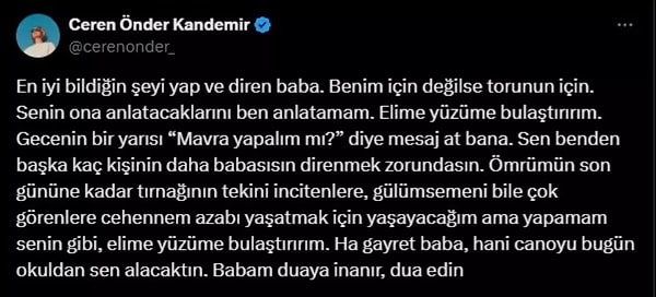 ‘En güzel bildiğin şeyi yap ve diren baba. Benim için değilse torunun için. Senin ona anlatacaklarını ben anlatamam. Elime yüzüme bulaştırırım. Gecenin bir yarısı ‘Mavra yapalım mı?’ diye bildiri at bana. Sen benden öbür kaç kişinin daha babasısın direnmek zorundasın. Ömrümün son gününe kadar tırnağının tekini incitenlere, gülümsemeni bile çok görenlere cehennem azabı yaşatmak için yaşayacağım fakat yapamam senin üzere, elime yüzüme bulaştırırım. Ha çaba baba, hani canoyu bugün okuldan sen alacaktın. Babam duaya inanır, dua edin.’