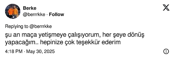 Berke, cezaevinden çıktıktan sonra attığı bir tweette ‘şu an maça yetişmeye çalışıyorum, her şeye dönüş yapacağım.. hepinize çok teşekkür ederim’ tabirlerini kullandı.