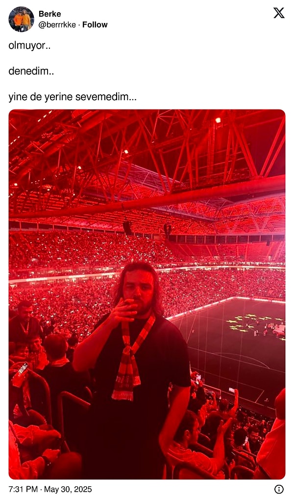 Berke, şampiyonluk kutlamaları esnasında çekilmiş fotoğrafını atarak ‘Olmuyor… Denedim… Tekrar de yerine sevemedim…’ paylaşımı yaptı.