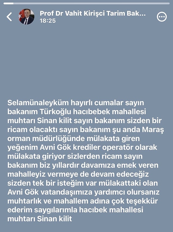 AKP Kahramanmaraş Milletvekili Vahit Kirişci’den skandal bir paylaşım geldi. Kirişci, kendisine gelen torpil talebini ezkaza WhatsApp durumunda paylaştı. Kirişci’den torpil isteğinde bulunan kişinin mahalle muhtarı olduğu görüldü.