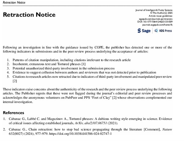Daha sonra geri çekilmiş birtakım araştırma makalelerine yapılan atıflar. (Bu atıfların, üçüncü taraf müdahalesi ve manipüle edilmiş hakemlik süreçleriyle bağlantılı olduğu anlaşılmıştır.)